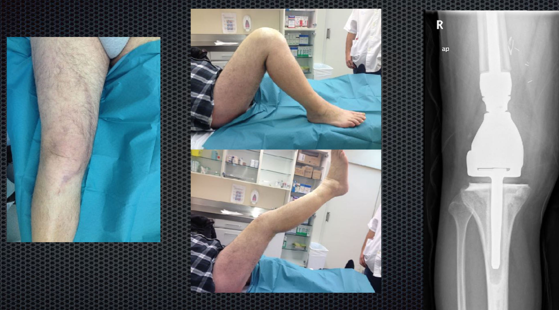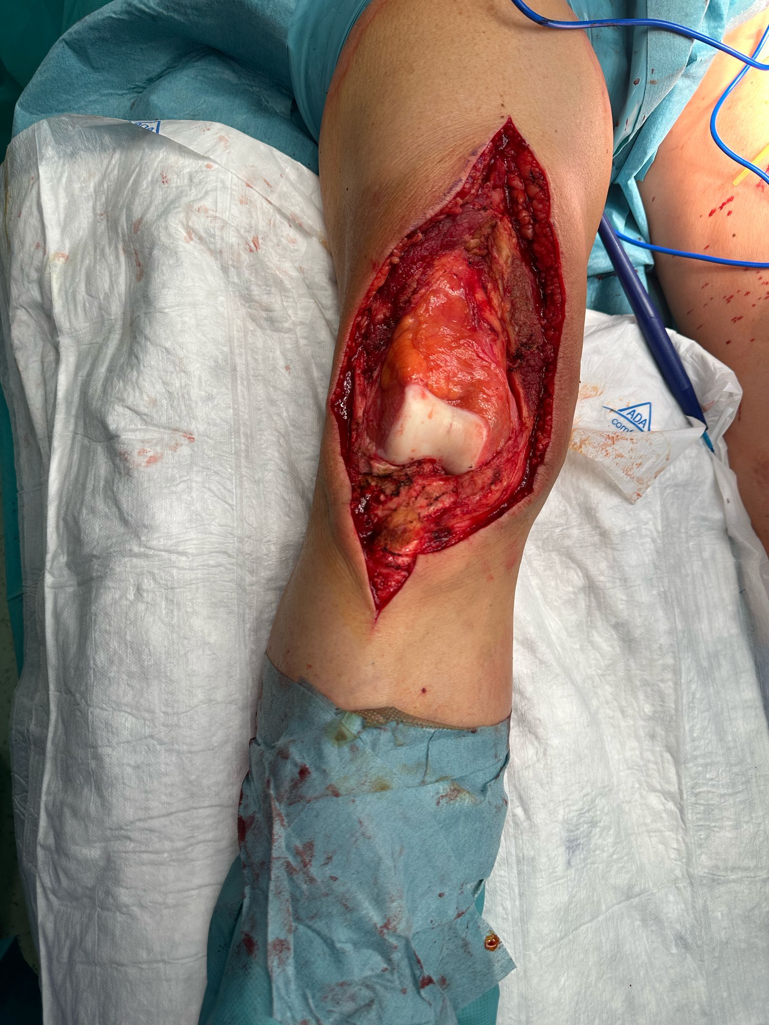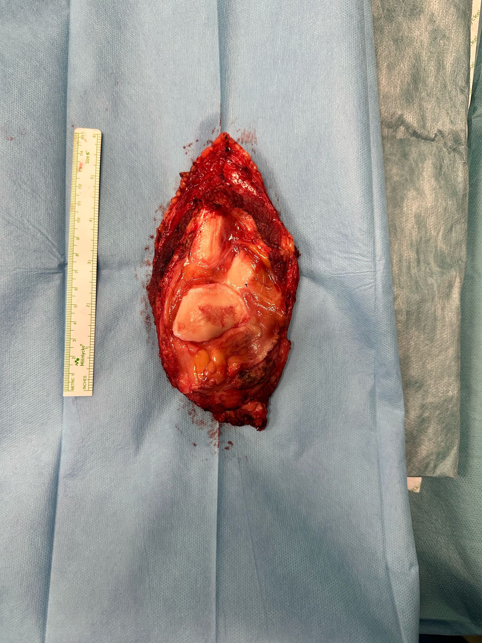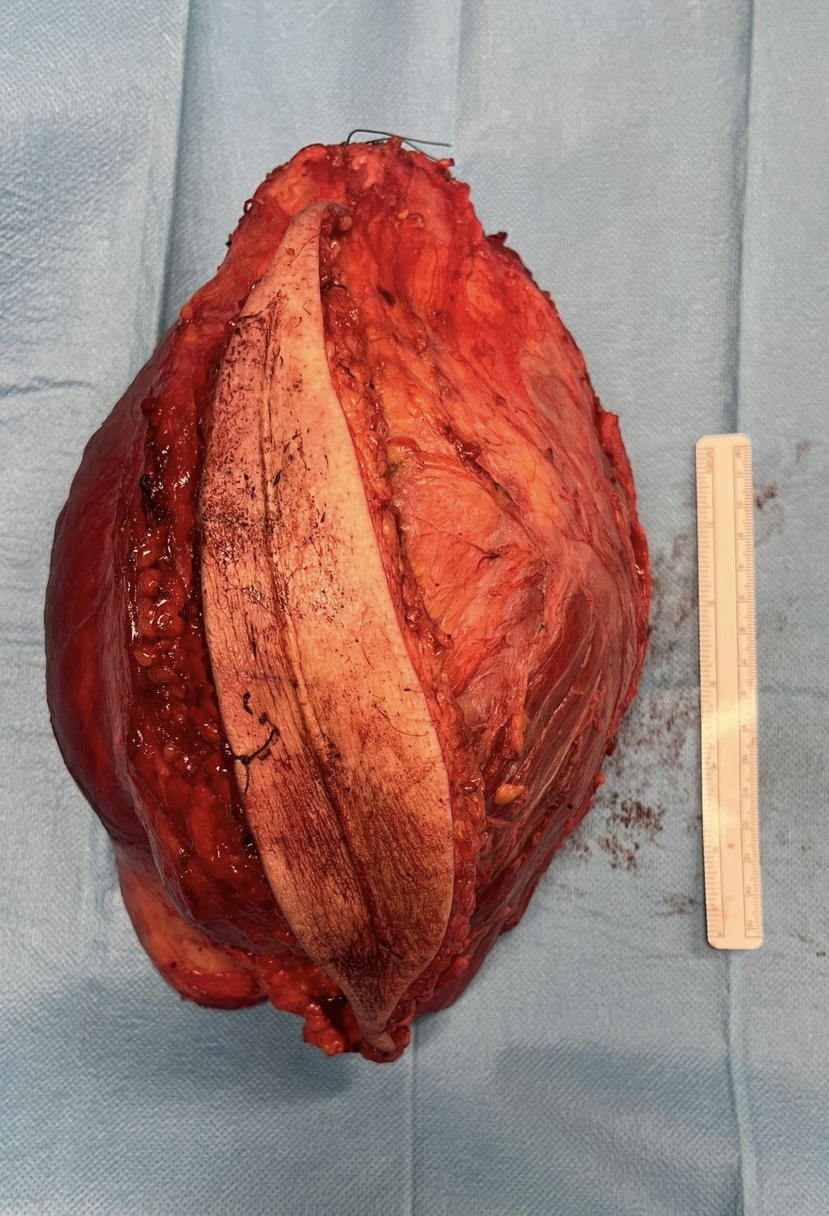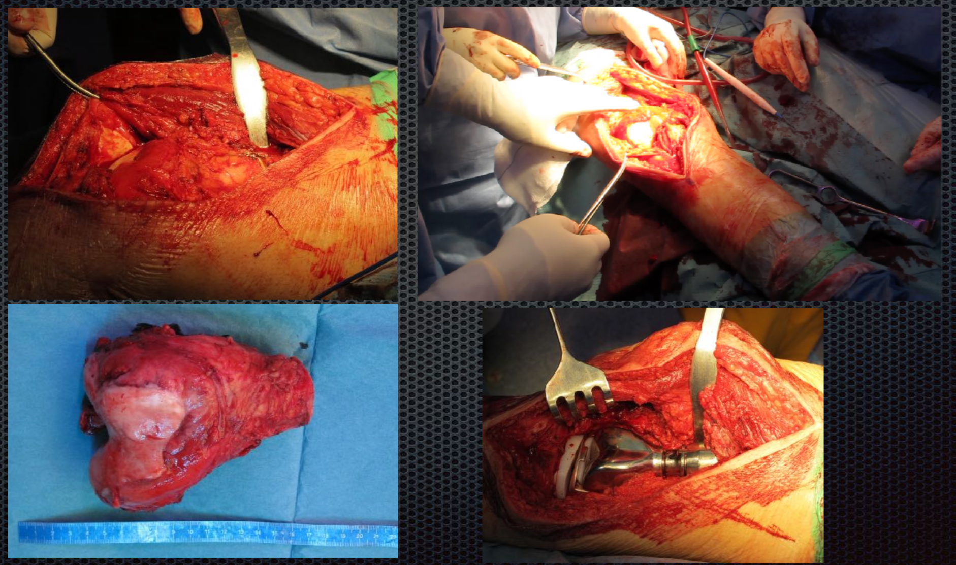 La pieza tumoral muestra, que con una planificación adecuada, podemos lograr una resección en la cual vemos el tumor completamente rodeado del músculo y hueso sano. Al lado de la pieza tumoral se visualiza el aloinjerto óseo de femur que utilizamos para reconstruir el defecto.