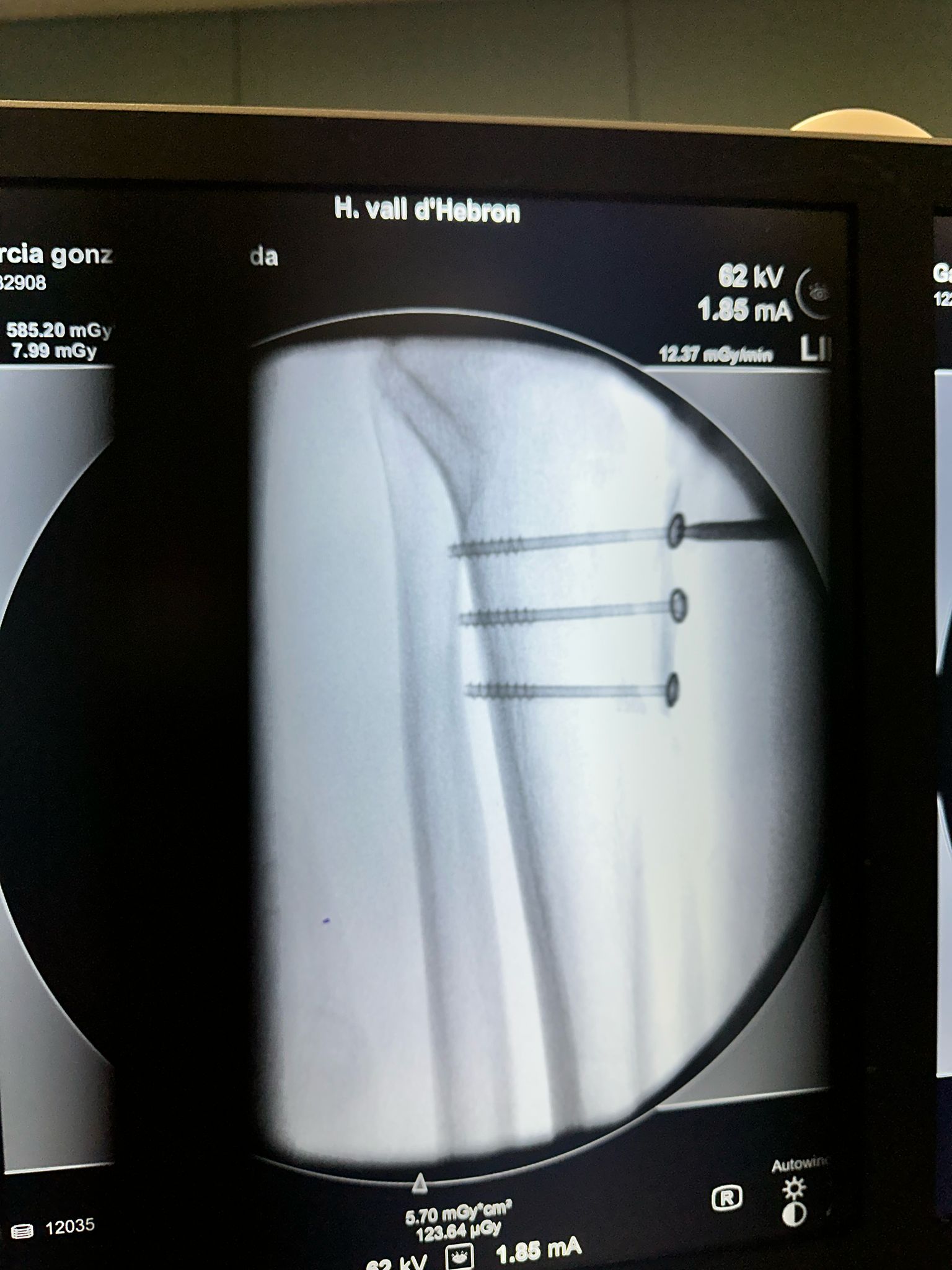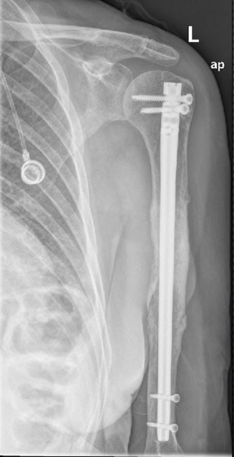 Para la reconstrucción utilizamos el aloinjerto óseo de femur y tres placas de osteosíntesis para restituir biológicamente la extremidad.