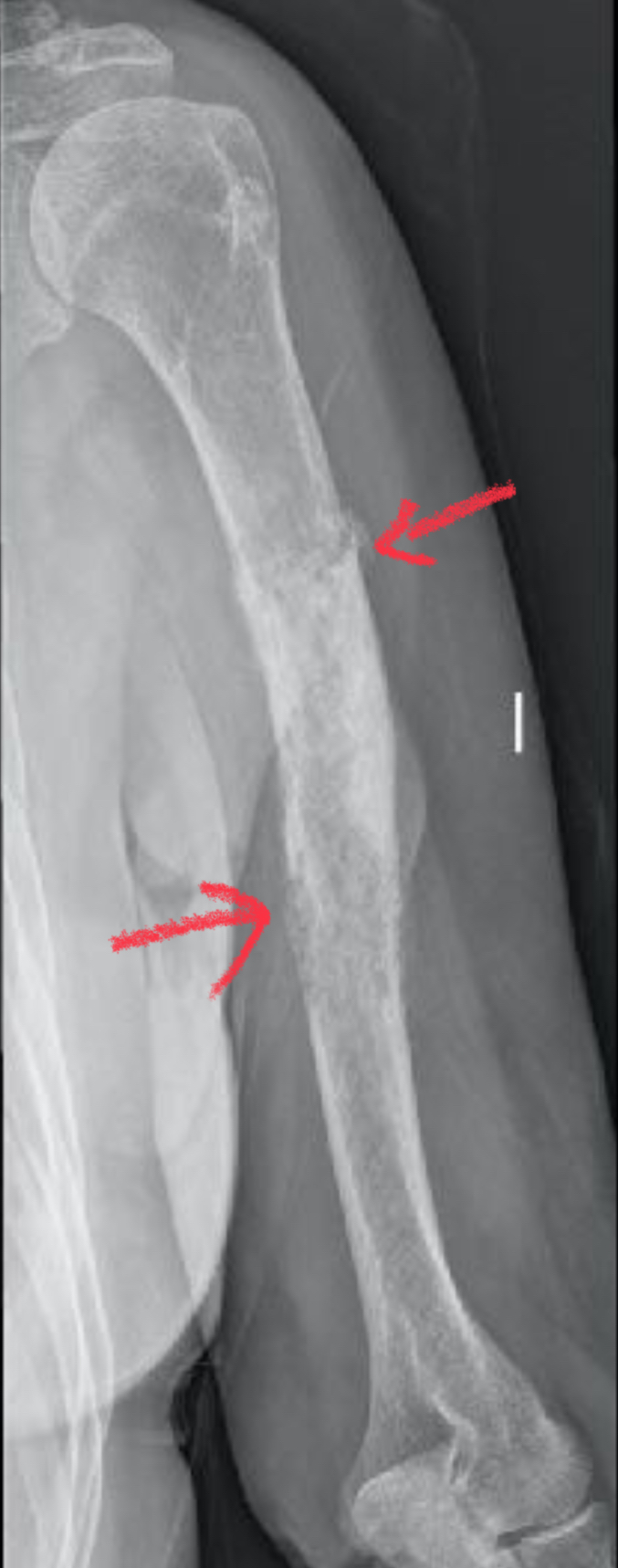• Ilustración explicativa de un encondroma intraóseo en el húmero, representado por nódulos azulados dentro de la médula ósea, con la zona claramente señalada para facilitar su identificación.