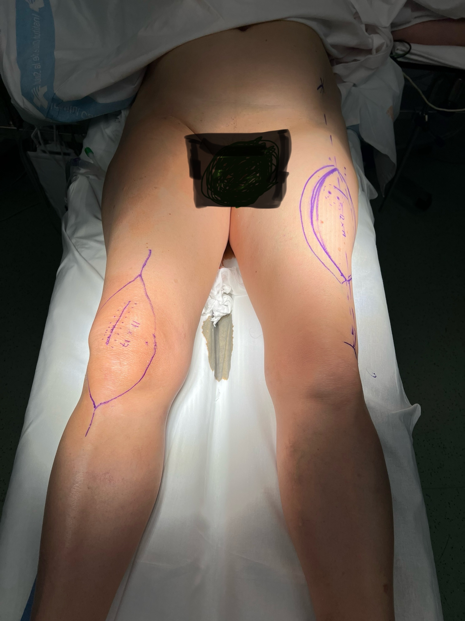 Debemos realizar los cortes en el femur siguiendo las líneas azules, dejando el área verde de seguridad (márgenes negativos) y lejos del area roja donde se encuentra el osteosarcoma
