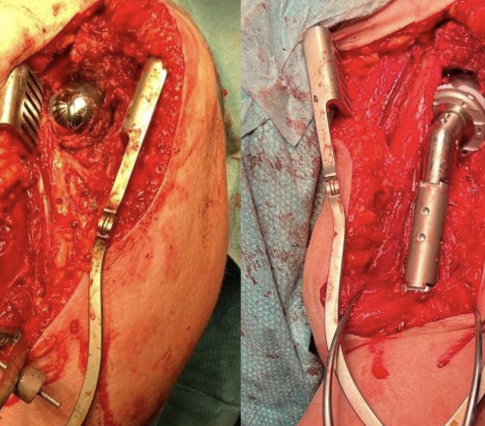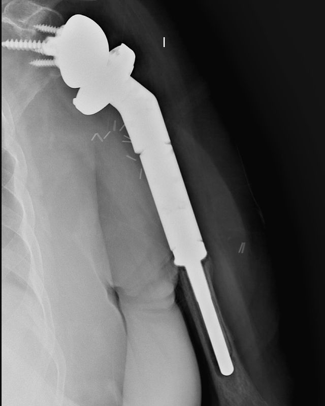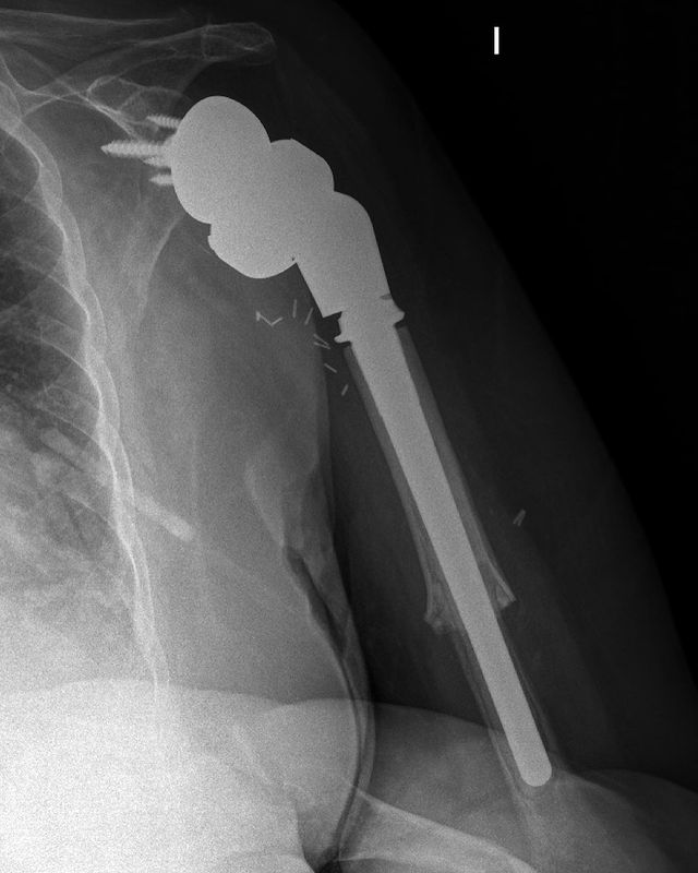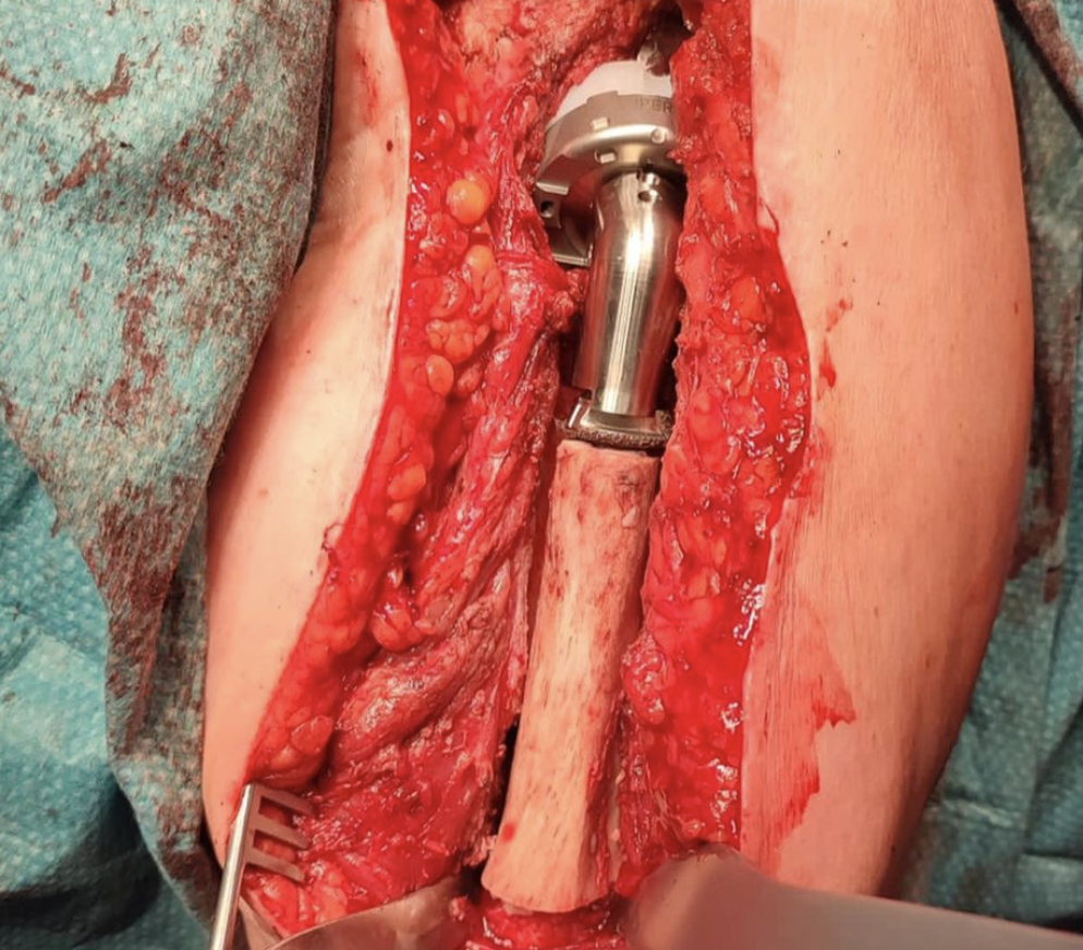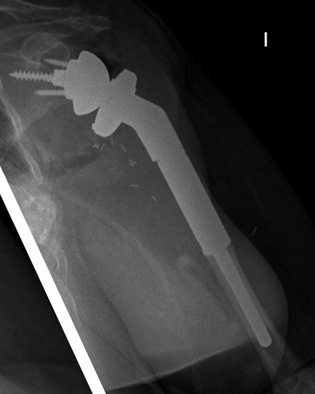 Hoy me gustaría compartir el caso de una mujer de 72 años con un condrosarcoma G3 de humero izquierdo (imágenes 1,2),  a quien hace 1 año se le realizó una resección (imagen 3) y reconstrucción con la megaprótesis invertida Comprehensive SRS cementada de Zimmer Biomet. (imagen 4) Radiografía de control (5). A los 6 meses presenta un aflojamiento aséptico (imagen 6). Retiramos el componente humeral (imagen 7) y reconstruimos con un ALOINJERTO TELESCOPICO PRESSFIT (imagen 8) y un nuevo componente humeral mas corto (imagen 9) Radiografías de la reconstrucción AloProtésica (imagen 10)