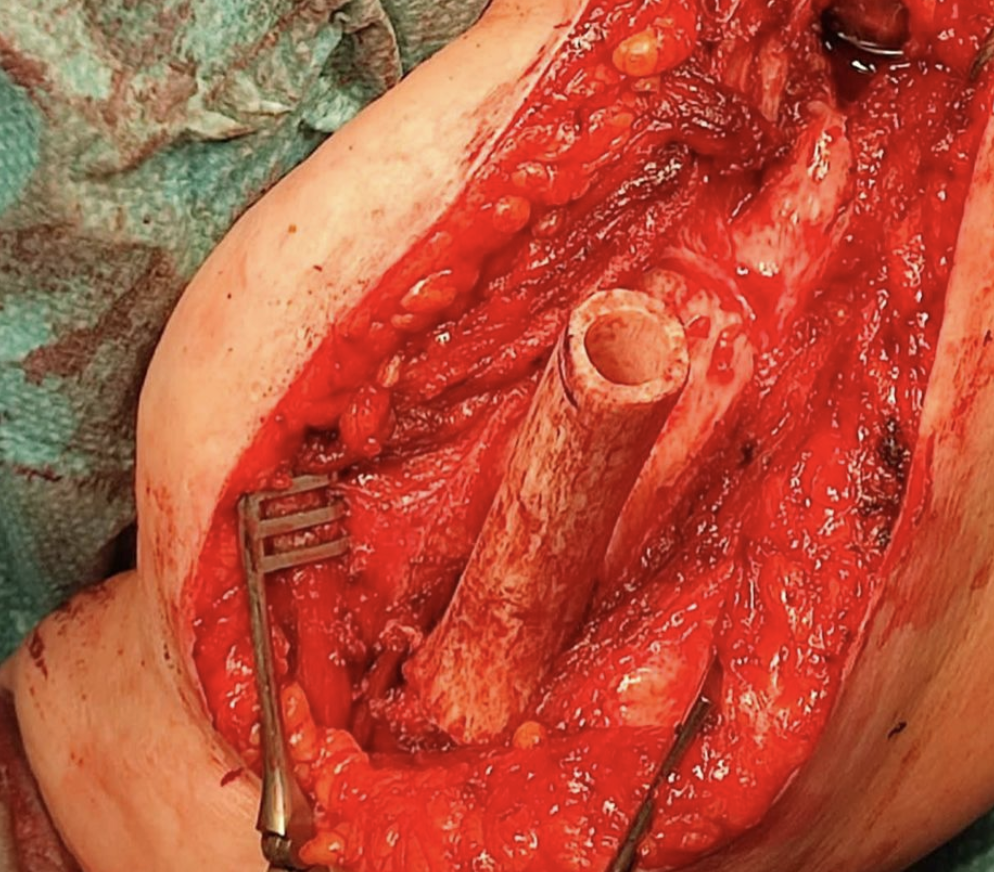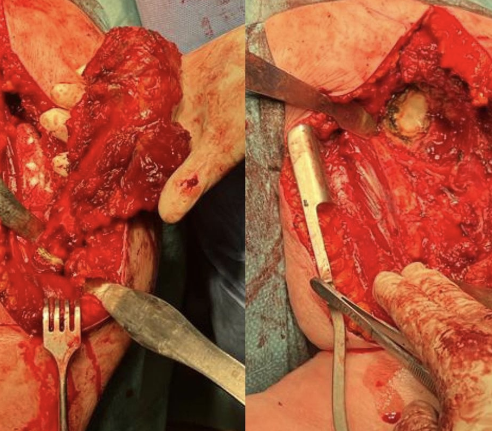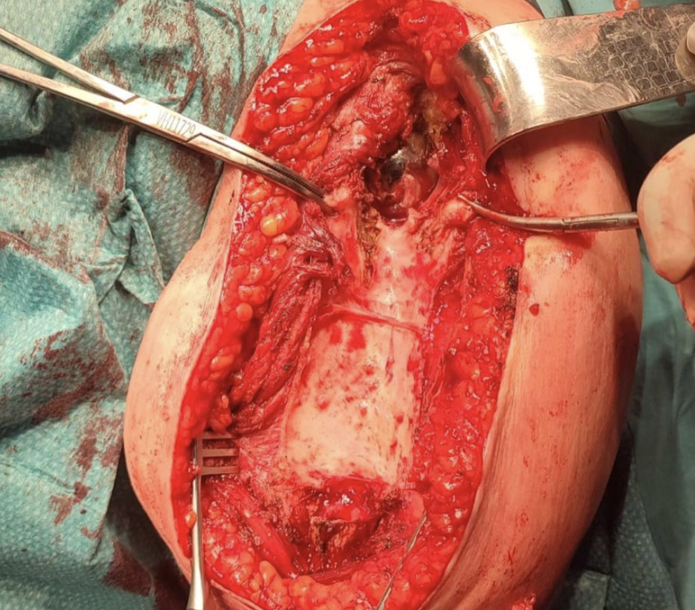 La reconstrucción definitiva se llevó a cabo hace unos 6 meses. A día de hoy, el paciente se encuentra libre de enfermedad y ha logrado una movilidad satisfactoria, caminando con la ayuda de una muleta.