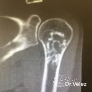 La lesión del humero izquierdo es un ENCONDROMA en concreto.